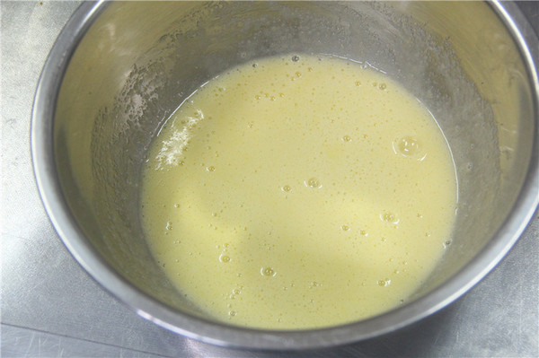 2、白糖倒入碗里,加入雞蛋用蛋抽將雞蛋打散,再加入牛奶攪拌均勻