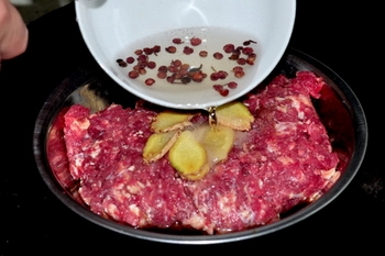 2、加花椒汁、姜片、鹽、料酒碼味一個(gè)小時(shí)