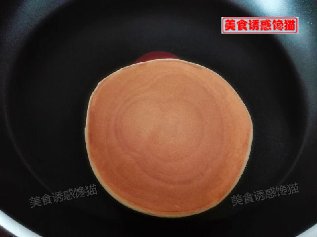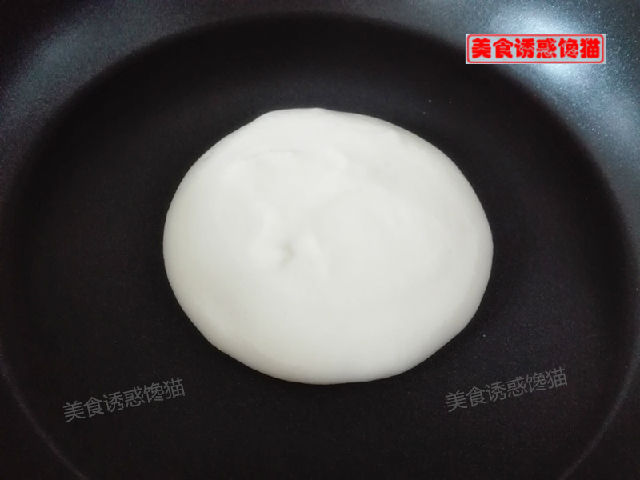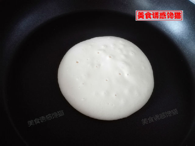 4、平底不粘鍋預(yù)熱,不用放油,舀一勺面糊倒入,讓面糊自然流淌成圓形,全程小火。