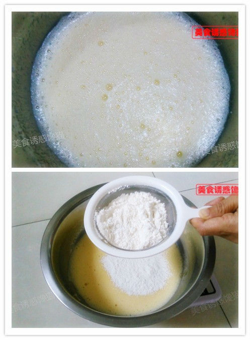1、蛋清、蛋黃分離。牛奶、油、鹽、蛋黃拌勻后,加入過(guò)篩后的低筋粉拌勻。拌好的蛋黃糊不要過(guò)度攪拌,以免起筋。