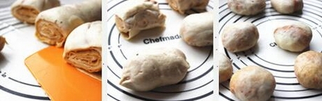 8、兩頭揪起來捏緊,包住麻醬,收口團(tuán)一團(tuán)壓在下面,略微按扁一些。