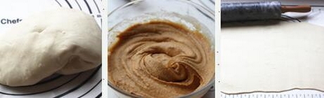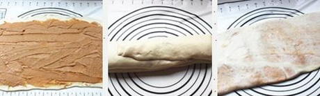5、抹好麻醬的面片卷起來,兩頭如圖折上去,按一下按扁,然后再放置醒發(fā)15分鐘。
