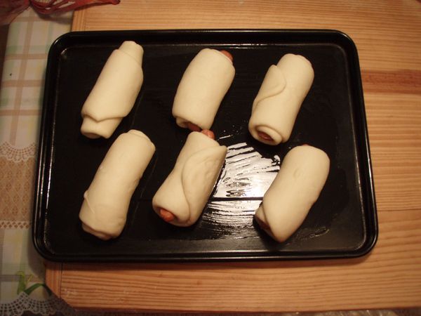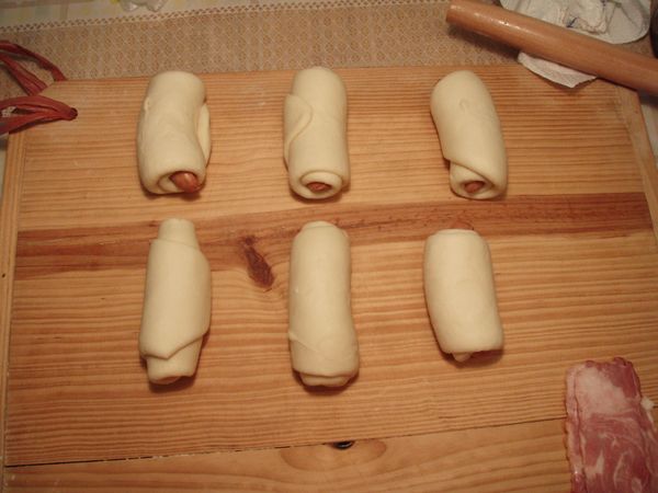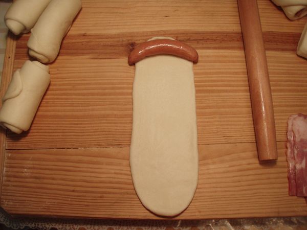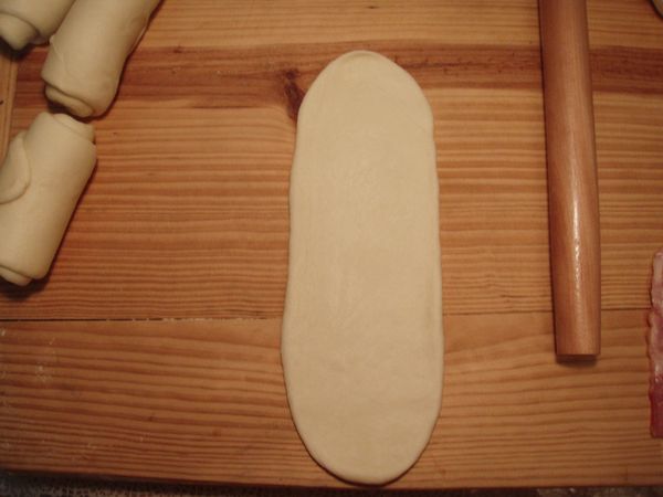 4、拿一根培根腸,放在長條狀面片上。