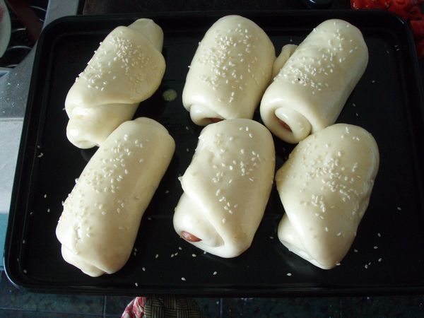 7、待二次發(fā)酵完成后,在面團上刷上蛋液,灑上芝麻。