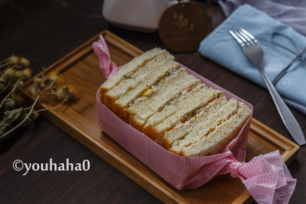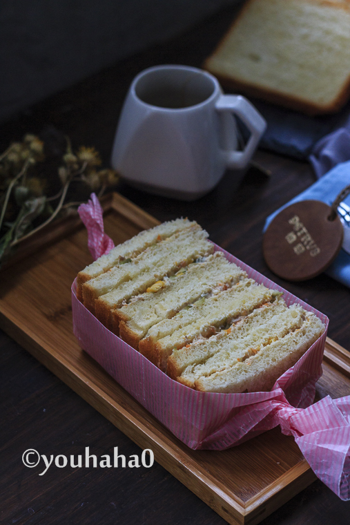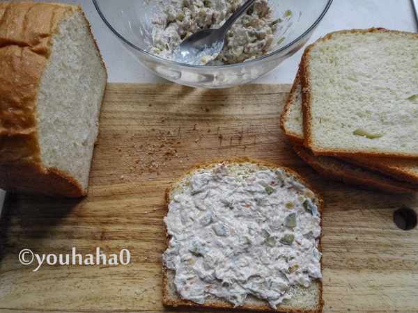 8、酸黃瓜切小丁與沙拉醬金槍魚(yú)拌勻,面包切片涂抹金槍魚(yú)沙拉醬,蓋上一片面包,切掉周邊,對(duì)切開(kāi)即可,配一杯豆?jié){或牛奶,健康營(yíng)養(yǎng)早餐