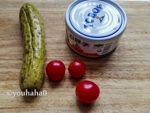7、準(zhǔn)備材料做三明治的夾餡,酸黃瓜一根、沙拉醬金槍魚(yú)一罐,圣女果擺上未用