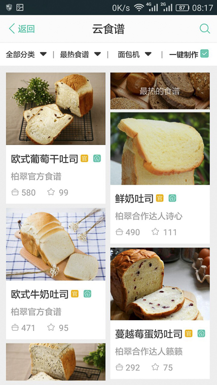 2、啟動(dòng)云食譜,選擇其中的歐式牛奶面包,點(diǎn)開(kāi)后出現(xiàn)操作步驟及配料,按照配料表中的要求準(zhǔn)備材料