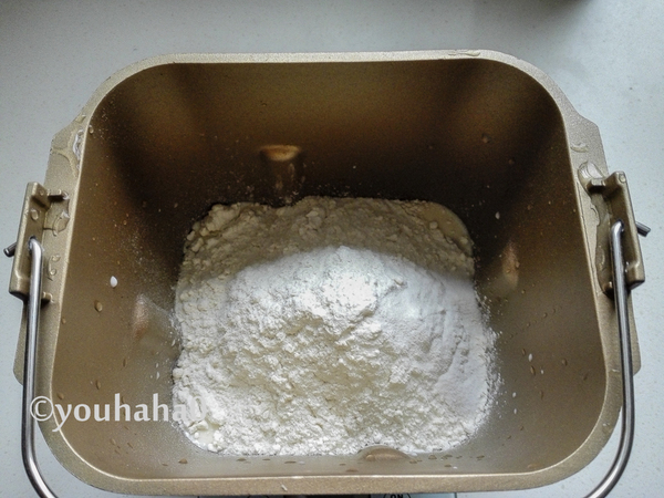 3、所有的食材全部放入面包機(jī)桶中,放入順序是先液體、酵母后粉類(lèi),鹽最后放