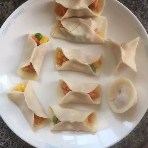 將香腸切丁跟玉米粒、青豆、胡蘿卜丁一起放入碗中,打入一個(gè)雞蛋攪拌均勻,加入少許鹽、味精攪拌。拿起一張餃子皮,將餡兒裝入,如上圖只需捏起餃子皮兩邊即可,當(dāng)然也可隨意發(fā)揮。