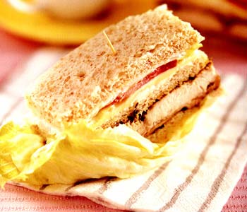 3.取1片全麥吐司,抹上美乃滋,依序鋪上輔料,蓋上第2片吐絲,抹上美乃滋,放上香料雞排,再蓋上第3片吐司便完成總匯