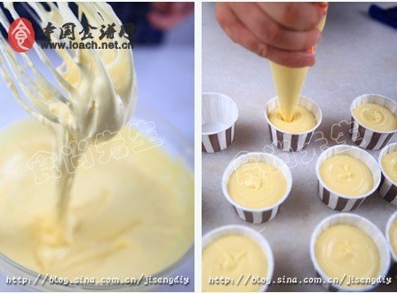 6.裝入裱花袋內(nèi)擠入模具杯內(nèi)8分滿,攪拌均勻。