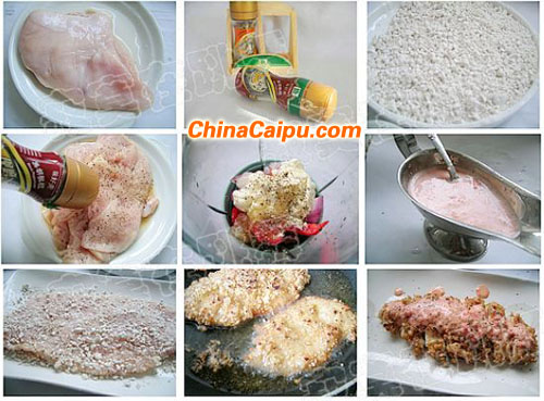 1、雞胸肉洗凈去掉表面的筋薄,片成3片,用料酒、鹽、糖和黑胡椒腌制片刻