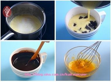 2、將B料混合,拌勻后攪打至蛋黃濃稠并顏色變淺。然后將巧克力黃油溶液倒入其中,攪拌均勻。