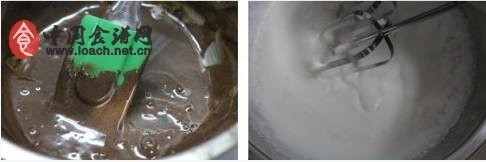 2、淡奶油加細砂糖攪打至濃稠時將步驟1的巧克力糊放入