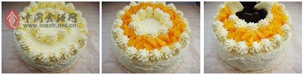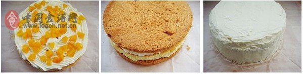 5、蓋上一片蛋糕片,再擠滿打發(fā)的鮮奶油撒黃桃粒。依次做好三層。
