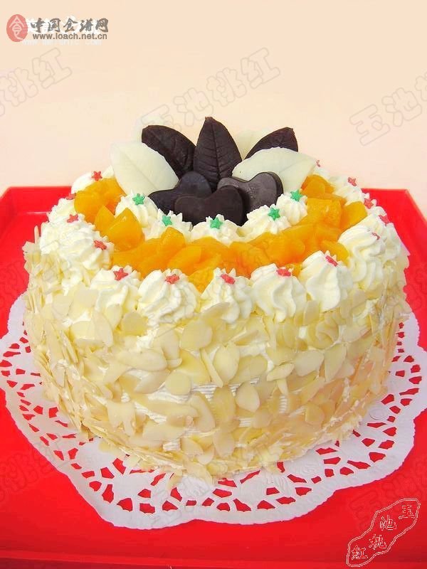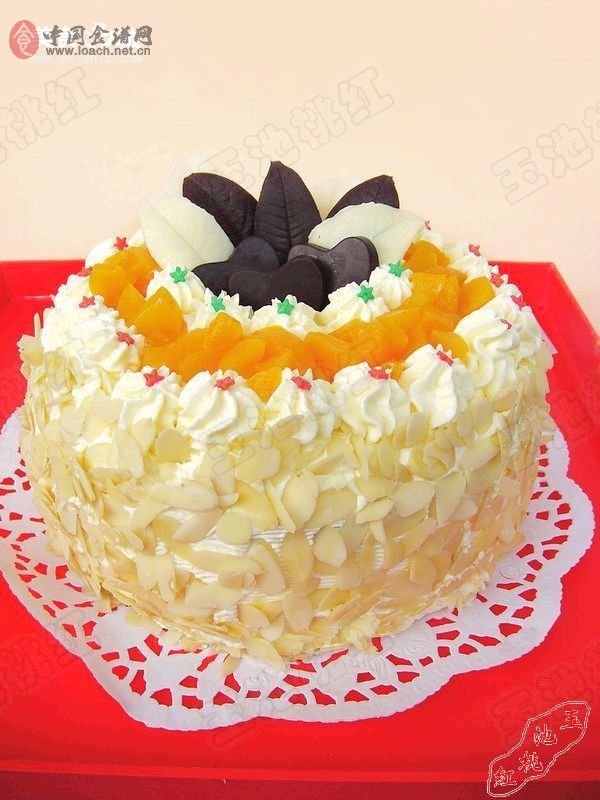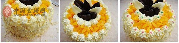 7、我在蛋糕的周圍擠了一圈花紋,然后放一圈黃桃粒,再擠一圈花紋,最里面放了我自己用白巧克力和黑巧克力做好的樹葉和心形巧克力塊,用彩色巧克力星放在了每個(gè)花紋上。