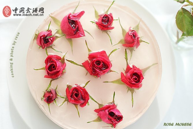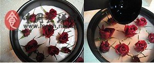 我用的玫瑰水是買現(xiàn)成的鮮玫瑰飲料,是含糖的,如果沒有,可以用玫瑰花茶泡一些,按照自己的喜好加些糖。玫瑰花最好買食用的,但我沒買到,就用普通的了。吃的時候沒吃花的部分。