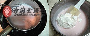 3.關(guān)火后將1大勺玫瑰水和2滴色素倒入2中攪勻