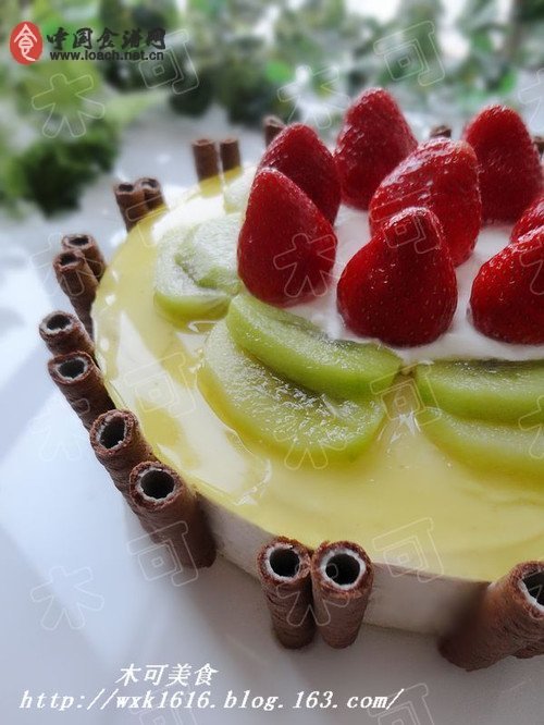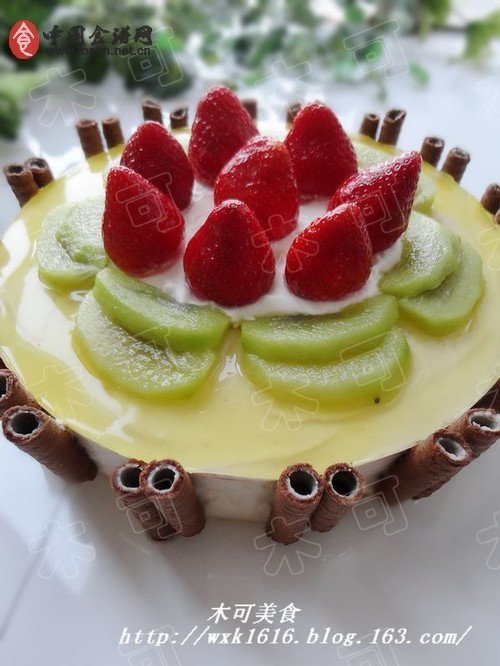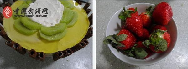 2、淡奶油100克加10克糖打發(fā)后,放到獼猴桃片中間。擺上洗凈的草莓。