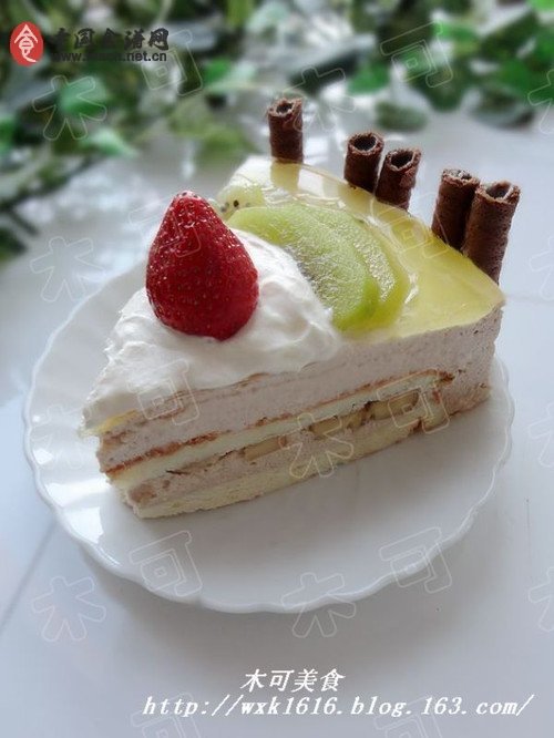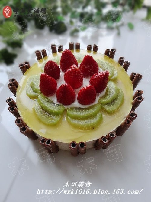 3、草莓味QQ糖加少許水,隔水融化后,在蛋糕上的水果表面刷一層,保持水果的鮮亮。一個香蕉慕斯蛋糕就完成了。