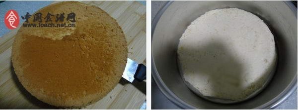 1、戚風(fēng)蛋糕裁下兩個約2CM厚的薄片,修剪一圈。一片比八寸活底模略小一點,另一片再小一點。稍大的蛋糕片放到模具里。