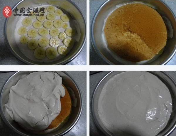 2、倒上一半慕斯餡晃勻。鋪上香蕉片,再放上稍小的蛋糕片。倒入剩下的慕斯餡,晃勻后,入冰箱冷藏1小時。