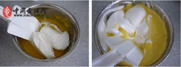 4、取三分之一的糖蛋白加入蛋黃糊中,上下翻動拌勻后,全部倒到糖蛋白中,上下翻動拌勻。