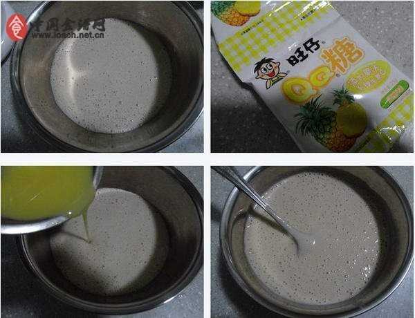 1、牛奶160克加香蕉用料理機攪打成泥,牛奶80克加QQ糖,隔水融化,放涼后,加入香蕉泥中,攪勻。