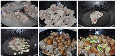 6.放入切好的蔥姜繼續(xù)翻炒,直到將肥肉炒出油。這步一定要有耐心,因?yàn)閷⒎嗜獬闯鲇秃笤贌?,燉熟后肥肉不會那么油膩?br data-OsVO="8dTsRG">7.加入適量的鹽和生抽,倒入開水,水要沒過肉塊,中途需要撇去浮沫。一直燉到肉軟爛,然后大火收湯,加上少許雞精調(diào)味