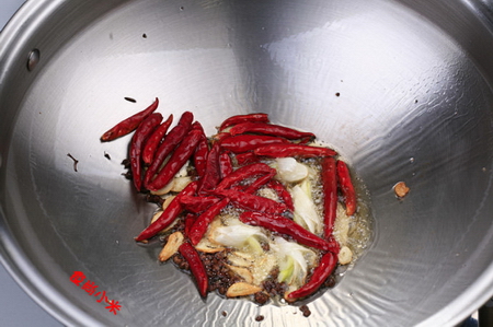 2、蔥姜蒜炸透,下入紅油辣醬、干辣椒,翻炒出香味燒至六七成熱時,