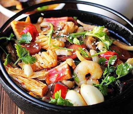 做法:1)木耳、腐竹事先用清水泡發(fā),木耳清洗干凈后去掉根蒂,撕成小塊、腐竹切小段2)其他各種蔬菜清洗干凈,該去皮的去皮,再改刀成塊狀或片狀3)準(zhǔn)備各種肉類,然后五花肉切片、蔥姜切片、切絲備用,香腸切片,蟹柳切段4)準(zhǔn)備各種調(diào)料,紅辣椒和干辣椒切碎、豆瓣醬剁碎5)燒開一鍋水,水中放一小勺鹽,分別將各種蔬菜入鍋焯熟,撈出后控干水分,將蝦仁和魷魚片也一起焯熟6)鍋中放兩勺油(和平時(shí)炒菜差不多就好),油燒熱后,將剁碎的豆瓣醬下鍋煸炒,炒出紅油7)放紅辣椒和干辣椒(辣椒的量隨自己喜好),放入五花肉炒熟8)加入蔥姜蒜、洋蔥、青椒片煸炒9)加入蟹柳、香腸和焯熟的魷魚卷和蝦仁煸炒10)最后放入焯熟的各種蔬菜11)隨個(gè)人口味加入半小勺鹽、1小勺糖、1小勺辣椒油和少許花椒粉12)最后撒入烤熟的花生和白芝麻13)撒些孜然和香菜即可出鍋