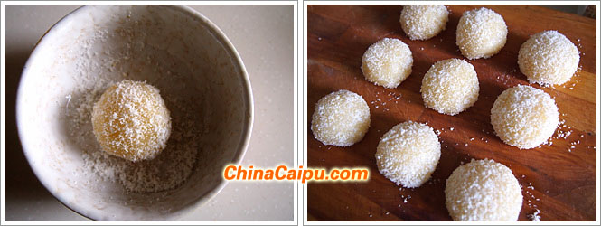 13、出鍋后,趁熱立刻裹上椰蓉,涼了不容易裹上了。