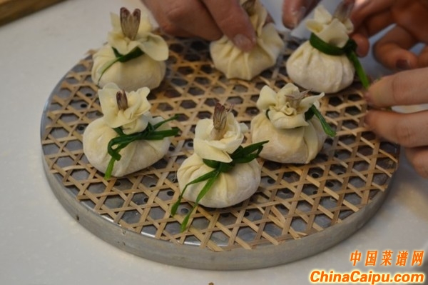燒賣包口處打好蝴蝶結(jié),制作好的燒賣排盤放進(jìn)電鍋,加1量杯水,蓋上鍋蓋