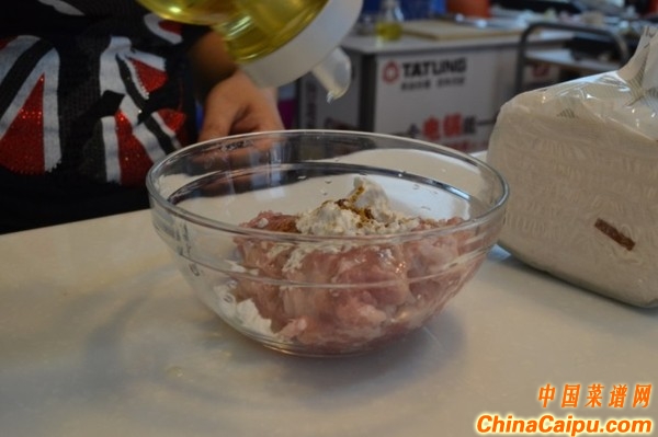 豬肉洗凈切碎,加入鹽、糖、生粉油均勻攪拌制作餡料,餡料完成后分成6份