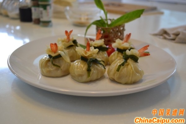 3.分別用餃子皮上將已腌制好的鮮蝦放入豬肉餡中間,把餃子皮包起,把蝦尾留在外面