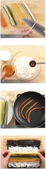 胡蘿卜洗凈去皮(40g), 黃瓜清洗搓揉切成長20cm 寬.厚0.7cm左右的段, 去籽后(60g)各自放入鹽, 腌制5分鐘左右后,用棉布拭去水分. 日式蘿卜咸菜切成長20cm 寬.厚0.7cm 左右的段。 牛蒡去皮(86g),切成長20cm 寬.厚0.7cm 左右的絲, 腌在醋水里2分鐘左右。