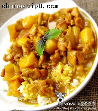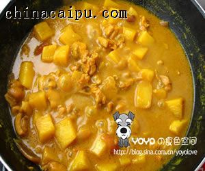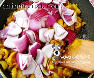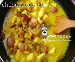 3、熱鍋融化黃油,加入蒜米、咖喱粉,轉(zhuǎn)小火爆香;?