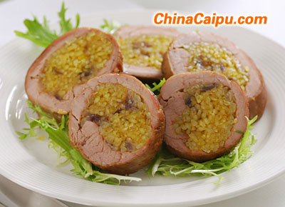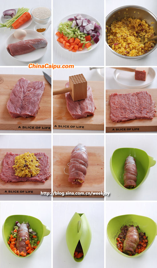 3.將2中的大米鋪在豬里脊肉片的中間,然后將肉片卷起用棉繩捆扎,放入樂葵料理碗中。