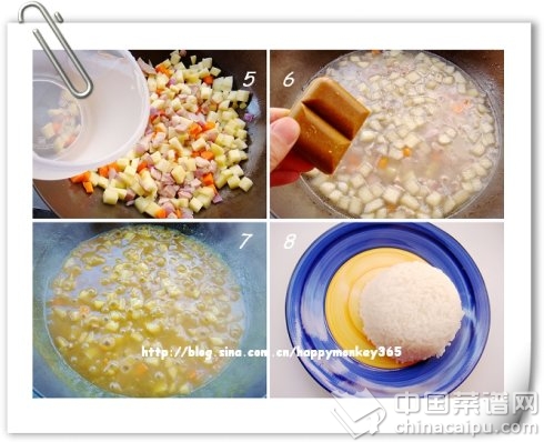 1. 我這次用的是咖喱塊,為了避免結(jié)塊,煮的時候放得較晚;如果是用咖喱粉,在炒過洋蔥等蔬菜后,即可撒入,再加水熬煮;