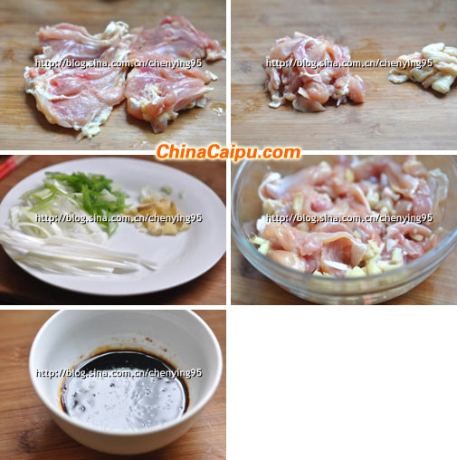 5、 雞肉切小長(zhǎng)條,放老姜、料酒腌制一會(huì)會(huì)