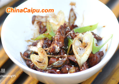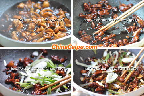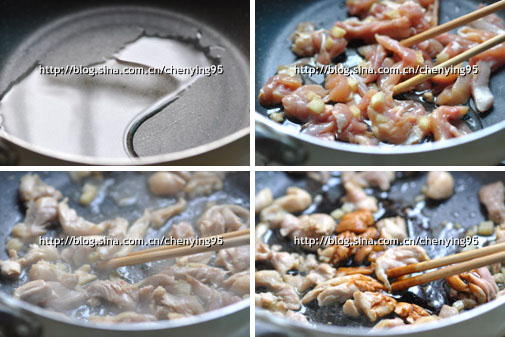 2、 開(kāi)火,將腌制好的雞肉放入拌炒