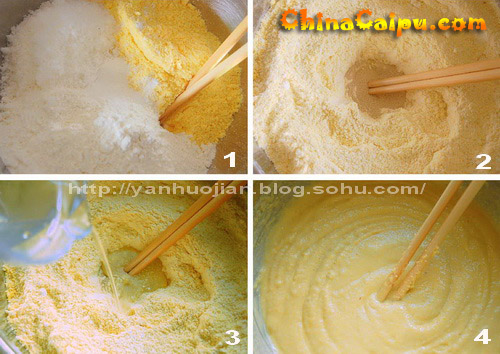 1、把玉米面、普通面粉、泡打粉、糖先混合拌勻