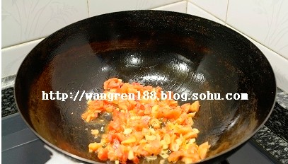 1、鍋中油熱后,放入蒜碎煸香,倒入西紅柿煸軟