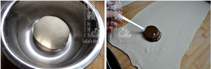1-2.將酵母在溫水中化開,靜置3、5分鐘;徐徐倒入面粉盆中,邊倒邊用筷子將面粉攪拌成雪花片狀,再搓揉成光滑面團(tuán);案臺(tái)上撒上手粉,將面團(tuán)用搟面仗搟成長(zhǎng)方形面片,芝麻醬加入糖、鹽混合均勻,涂抹在面片上;