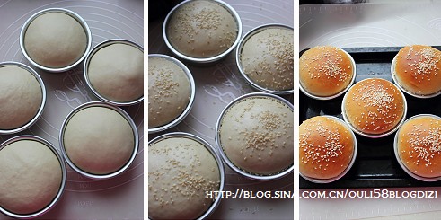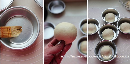 3、面團(tuán)放入模具中發(fā)酵,發(fā)酵至模具滿后,刷蛋水,撒