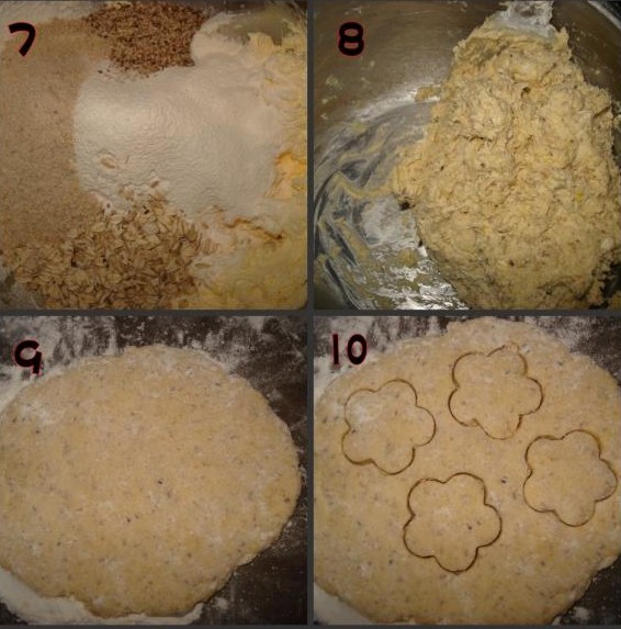 7、篩入粉類,倒入芝麻、全麥粉、燕麥片;