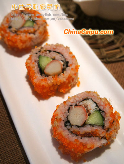 5、外卷,海苔鋪上米飯,翻面,第一層是壽司簾,然后保鮮膜,同樣,放上蟹肉棒、蟹肉、沙拉醬、蟹子,黃瓜。卷實了,再用壽司簾調(diào)整一下形狀,刀粘上水,切片。