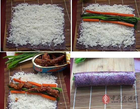 罐頭打開,取出魚放上,借助壽司簾把它卷起來,要卷的盡量瓷實。放置一會兒定型后切成1厘米多一點的段。