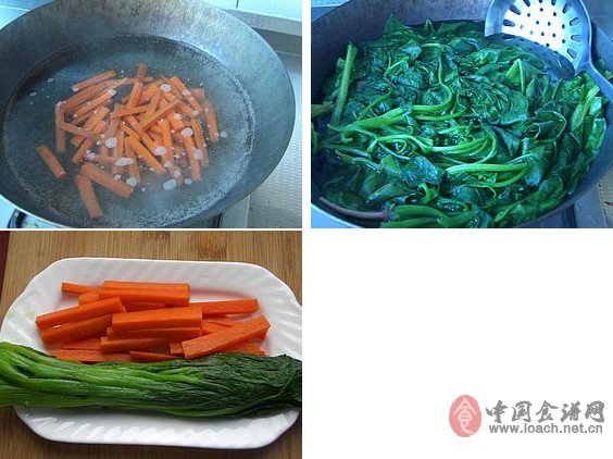 胡蘿卜切條,開水焯燙熟。菠菜洗凈,焯燙熟。焯燙好的菜濾掉水備用。