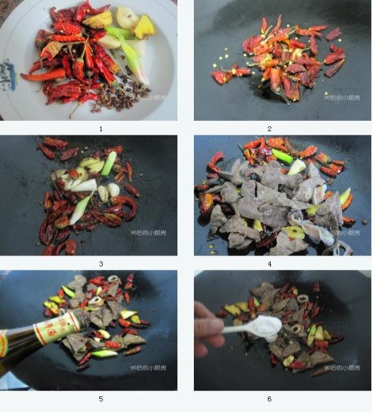 原料:處理好的豬肺適量、小的干辣椒、大的干辣椒、青蒜段、生姜、花椒